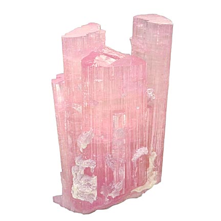 Four main attached tourmaline crystals. Mostly pink with some color banding. A small amount of lepidolite mica on the sides. Good luster with glassy terminations. From Paprock, Nuristan, Afghanistan.